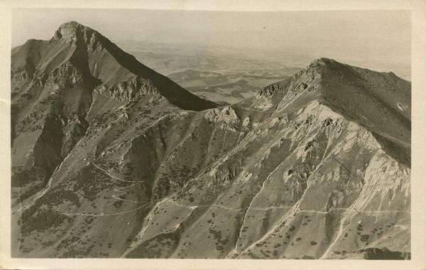 Widok na Tatry Bielskie. Od lewej: Płaczliwa Skała, Szeroka Przełęcz Bielska, Szalony Wierch. Na stokach widoczny szlak turystyczny prowadz±cy na Przełęcz pod Kop±.