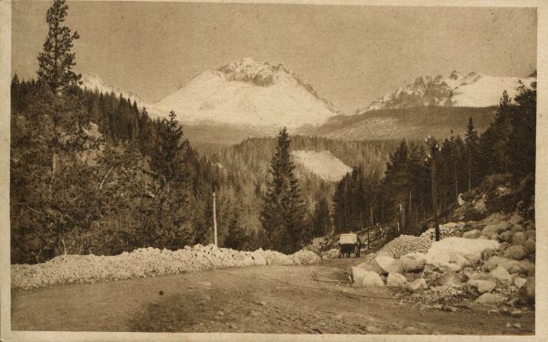 Widok na Gerlach z Tatrzańskiej Polanki. Na pierwszym planie Droga Wolności, na niej wóz. W głębi las, w tle Gerlach.