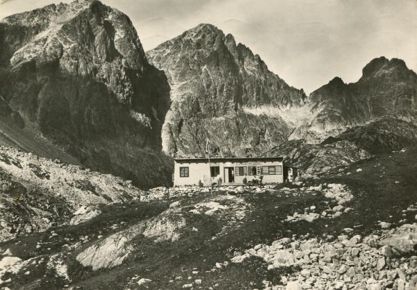 Widok na schronisko Zbójnickie w Dolinie Staroleśnej. W tle szczyty: Baniasta Turnia, Mała Wysoka, Rohatka i Dzika Turnia.