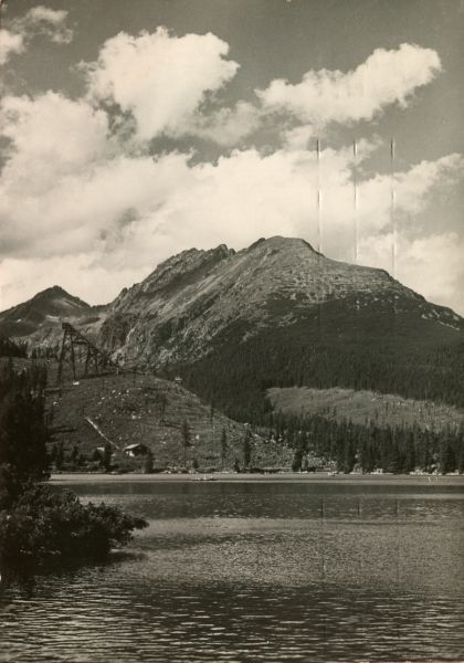Widok na Szczyrbskie Jezioro. W tle Szczyrbski Szczyt i Grań Baszt ze Skrajn± Baszt±. Po lewej stronie widoczna konstrukcja skoczni narciarskiej.