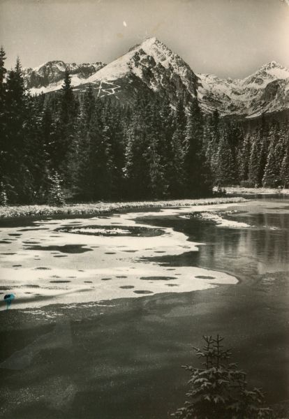 Widok na rozmarzaj±ce Nowe Szczyrbskie Jezioro. W głębi las. W tle Ostra, Wielkie Solisko i Szczyrbski Szczyt.
