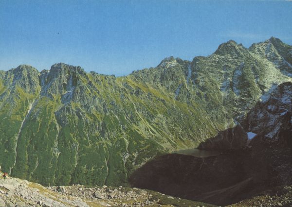 Widok z Dolinki za Mnichem na Czarny Stawu nad Morskim Okiem i otaczaj±ce go szczyty - od Żabiej Czuby przez Żabi Szczyt Niżni, Żabi Szczyt Wyżni, Niżnie Rysy po Rysy.