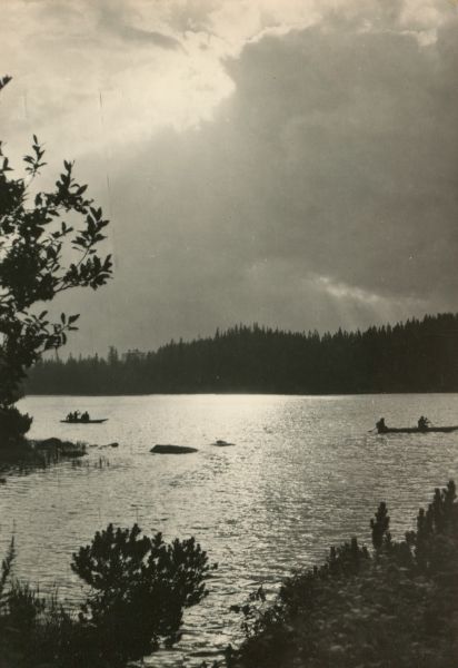 Widok na Szczyrbskie Jezioro. Na jeziorze łódki z turystami. Zachmurzone niebo.