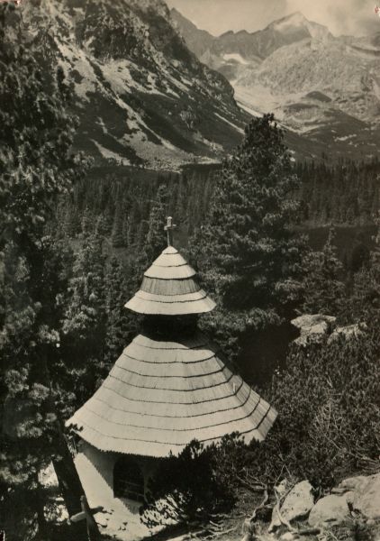 Widok na Dolinę Mięguszowiecką. Na pierwszym planie kaplica na Cmentarzu symbolicznym pod Osterwą. W tle Koprowy Szczyt.