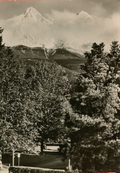 Vysoké Tatry - Tatr. Lomnica. Poh”ad na park, zasneŸenę Lomnickę a KeŸmarskę čtít 2556 m v lete.