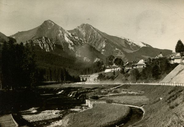 Widok na Hawrań i Płaczliw± Skałę w Tatrach Bielskich. Na pierwszym planie droga i potok, w głębi osada Zdziar.