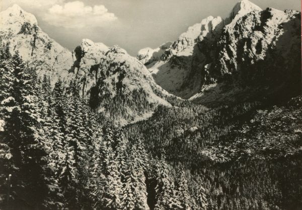 Widok na Dolinę Małej Zimnej Wody w zimie. Z lewej Pośrednia Grań z prawej Łomnica.