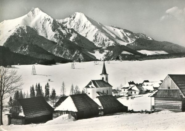 Widok na Zdziar w zimie. Na pierwszym planie ko¶ciół i zabudowania wiejskie. W tle Płaczliwa Skała i Hawrań.