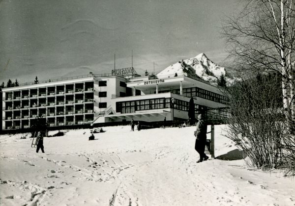 Budynek związkowego domu wypoczynkowego Morawa w Tatrzańskiej Łomnicy i jego otoczenie w scenerii zimowej. W tle Sławkowski Szczyt. Przed budynkiem wczasowicze.