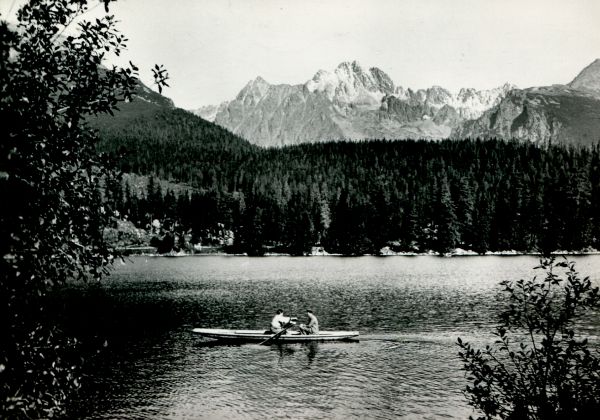 Widok znad Szczyrbskiego Jeziora na otoczenie Wysokiej. Po jeziorze pływaj± tury¶ci w łódce. W tle po lewej Kopa Popradzka, na prawo Ganek, Rumanowy Szczyt i Żłobisty Szczyt.