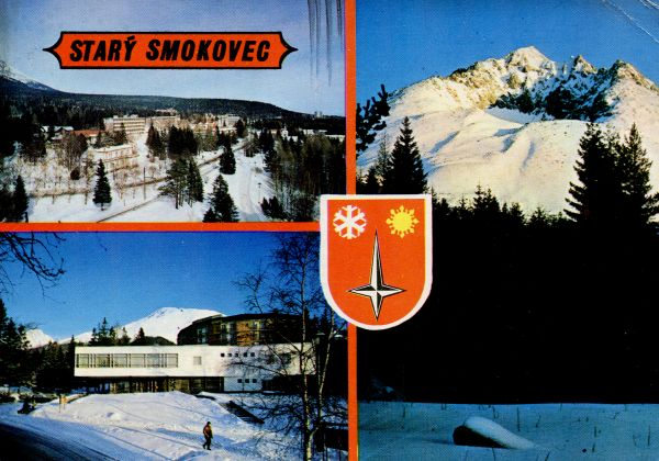 Szczyt. Napis: Starý Smokovec, w środku herb Starego Smokowca.