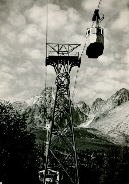 VYSOKÉ TATRY Lanovka na Skalnaté pleso (1761 m), dolu medzistanica Štart (1145 m), v pozadí Lomnický štít (2632 m)