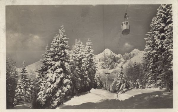 Wagonik kolei linowej na Łomnicę w drodze nad Łomnicki Staw w scenerii zimowej. W tle Łomnica i Kieżmarski Szczyt.