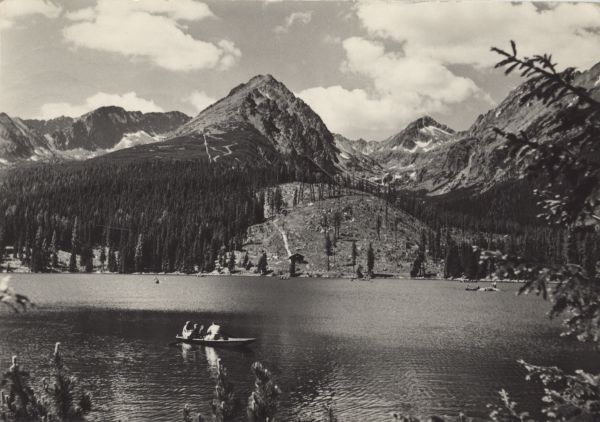 Łodzie na Szczyrbskim Jeziorze. W tle Ostra, Szczyrbskie Solisko, Szczyrbski Szczyt i grań Baszt. Pod Skrajnym Soliskiem widoczna skocznia narciarska.