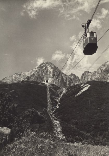 Wagonik kolei linowej na Łomnicę w drodze nad Łomnicki Staw. Widoczny budynek stacji przesiadkowej. W tle Łomnica, Widły i Kieżmarski Szczyt. Pod kolej± płaty kosodrzewiny (Pinus mugo Turra).