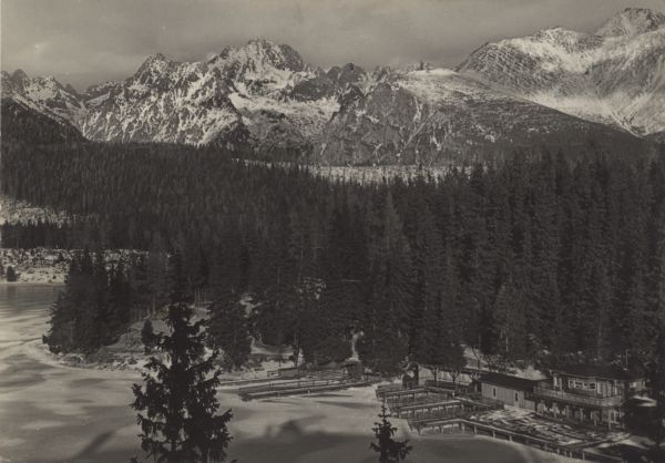 Widok na Szczyrbskie Jezioro w zimowej scenerii. W prawym dolnym rogu kąpielisko. W tle Kopa Popradzka, Wysoka, Osterwa, Tępa.