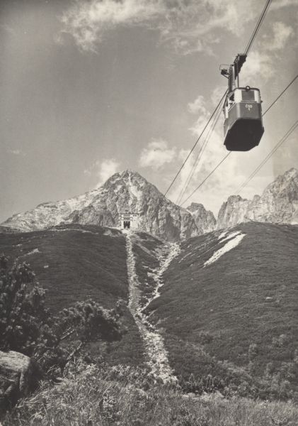 Wagonik kolei linowej na Łomnicê w drodze nad Łomnicki Staw. Widoczny budynek stacji przesiadkowej. W tle Łomnica, Widły i Kieżmarski Szczyt. Pod kolej± płaty kosodrzewiny (Pinus mugo Turra).