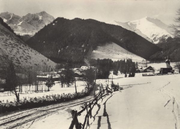 Osada Jaworzyna w zimowej scenerii. Widoczna zabudowa i kościół. W tle Baranie Rogi, Śnieżny Szczyt i Lodowy Szczyt, z prawej Szeroka Jaworzyńska.