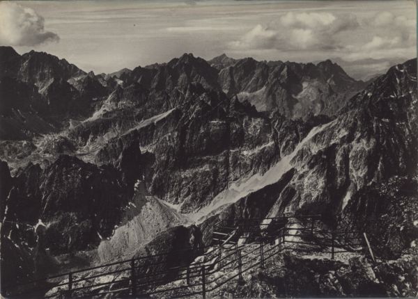 Widok z Łomnicy na zachód: na horyzoncie Gerlach, Wysoka, Krywań i Rysy. Po prawej Lodowa Kopa, na wprost Mały Lodowy Szczyt nad Dolin± Małej Zimnej Wody. Na szczycie Łomnicy widoczna platforma widokowa.
