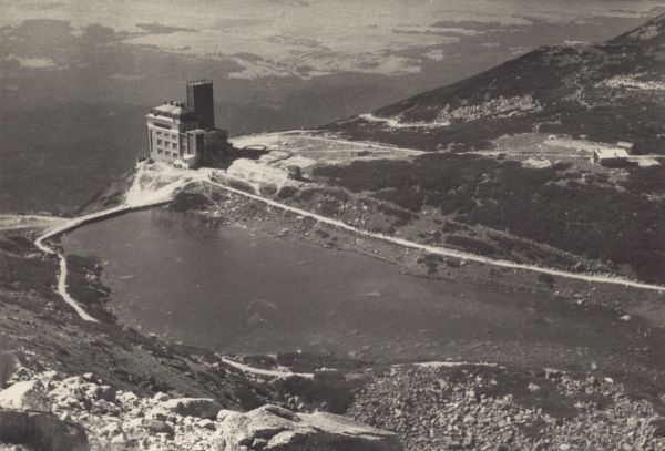 Widok na Łomnicki Staw w Dolinie Łomnickiej oraz stację kolei linowej i hotel Encián.