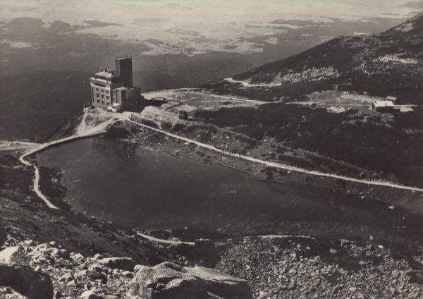 Widok na Łomnicki Staw w Dolinie Łomnickiej oraz stację kolei linowej i hotel Encián.