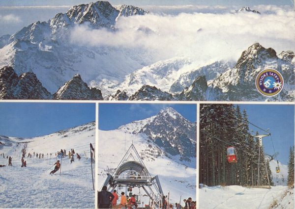 VYSOKÉ TATRY - WYSOKIE TATRY - HOHE TATRA - THE HIGH TATRAS Pohľad z Lomnického štitu ponad Malú a Veľkú Studenú dolinu na masív Gerlachovského štítu (2655 m). Skalnatá dolina - lyžovanie vo Francúzsjkej mulde. Stanica sedačkovej lanovky Poma do Lomnického sedla. Kabinková lanovka na Skalnaté Pleso