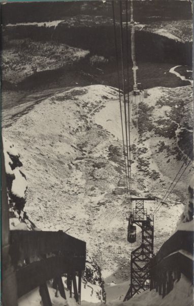 Górna stacja kolei linowej na Łomnicy - widok w dół, na Dolinę Łomnicką w zimowej scenerii. Widoczny wagonik kolei i podpora. U góry pocztówki pośrednia stacja kolei linowej nad Łomnickim Stawem.