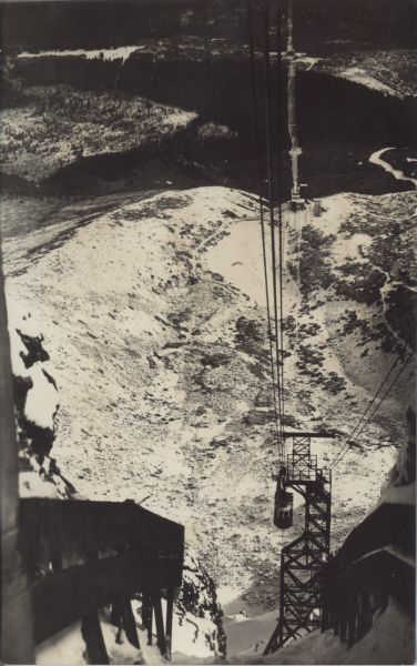 Górna stacja kolei linowej na Łomnicy - widok w dół, na Dolinę Łomnicką w zimowej scenerii. Widoczny wagonik kolei i podpora. U góry pocztówki pośrednia stacja kolei linowej nad Łomnickim Stawem.