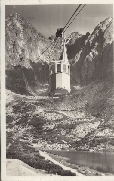Wagonik kolei linowej nad Doliną Łomnicką. W dole Łomnicki Staw. W tle Łomnica i Kieżmarski Szczyt.