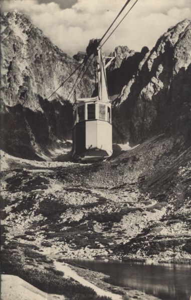 Wagonik kolei linowej nad Dolin± Łomnick±. W dole Łomnicki Staw. W tle Łomnica i Kieżmarski Szczyt.