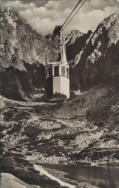 Wagonik kolei linowej nad Dolin± Łomnick±. W dole Łomnicki Staw. W tle Łomnica i Kieżmarski Szczyt.