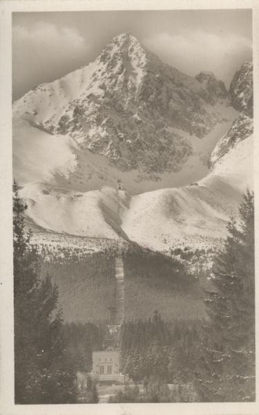 Widok na Łomnicę i trasę kolei linowej na szczyt w scenerii zimowej. Na pierwszym planie stacja początkowa w Tatrzańskiej Łomnicy, wyżej stacja pośrednia nad Łomnickim Stawem.