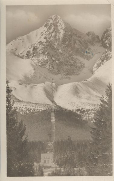 Widok na Łomnicę i trasę kolei linowej na szczyt w scenerii zimowej. Na pierwszym planie stacja początkowa w Tatrzańskiej Łomnicy, wyżej stacja pośrednia nad Łomnickim Stawem.