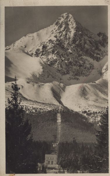 Widok na Łomnicę i trasę kolei linowej na szczyt w scenerii zimowej. Na pierwszym planie stacja początkowa w Tatrzańskiej Łomnicy, wyżej stacja pośrednia nad Łomnickim Stawem.