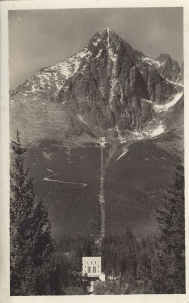 Widok na Łomnicę i trasę kolei linowej na szczyt. Na pierwszym planie stacja początkowa w Tatrzańskiej Łomnicy, wyżej stacja pośrednia nad Łomnickim Stawem.