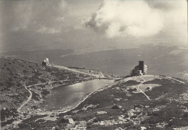 Widok na budynek stacji kolei linowej oraz hotel i restaurację Encián nad Łomnickim Stawem. Z lewej strony budynek Obserwatorium Astronomicznego Słowackiej Akademii Nauk.