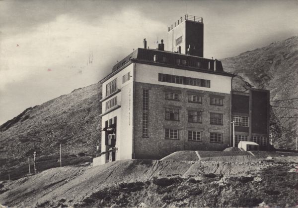 Widok na budynek stacji kolei linowej oraz hotel Encián (Gencjana) nad Łomnickim Stawem.