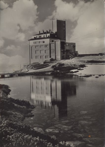 Widok na budynek stacji kolei linowej oraz hotel Encián nad Łomnickim Stawem. Budynek odbija się w wodzie.
