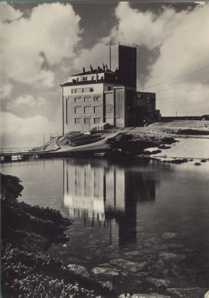 Widok na budynek stacji kolei linowej oraz hotel Encián nad Łomnickim Stawem. Budynek odbija się w wodzie.