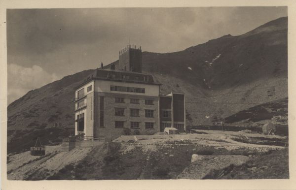 Widok na budynek stacji kolei linowej oraz hotel Encián (Gencjana) nad Łomnickim Stawem.