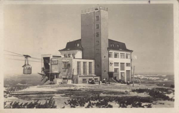 Widok na budynek stacji kolei linowej oraz hotel Encián (Gencjana) nad Łomnickim Stawem. Przed budynkiem opalający się turyści, z lewej strony widoczny wagonik kolei.