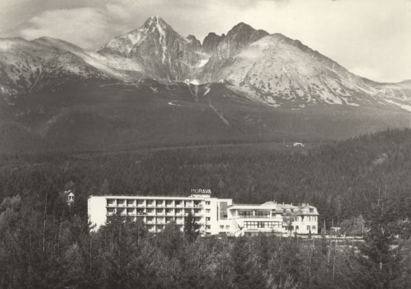 VYSOKÉ TATRY - Tatranská Lomnica (850 m) Zotavovňa ROH Morava V pozadí Lomnický štít (2632 m), Vidlové veže a Kežmarský štít (2558 m)
