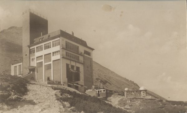 Widok na budynek stacji kolei linowej oraz hotel Encián (Gencjana) nad Łomnickim Stawem. Po prawej stronie budynek obserwatorium astronomicznego.
