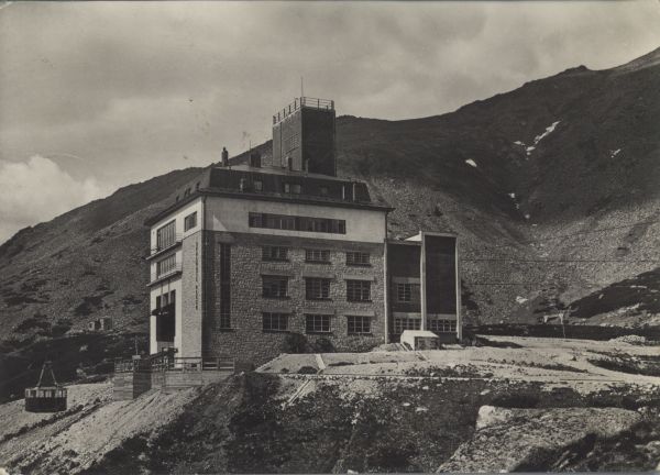 Widok na budynek stacji kolei linowej oraz hotel Encián nad Łomnickim Stawem.