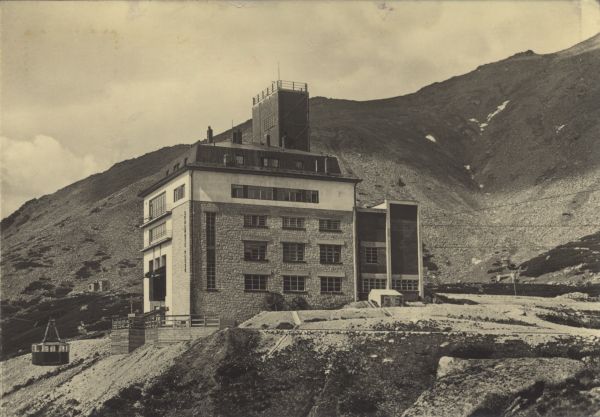 Widok na budynek stacji kolei linowej oraz hotel Encián (Gencjana) nad Łomnickim Stawem.