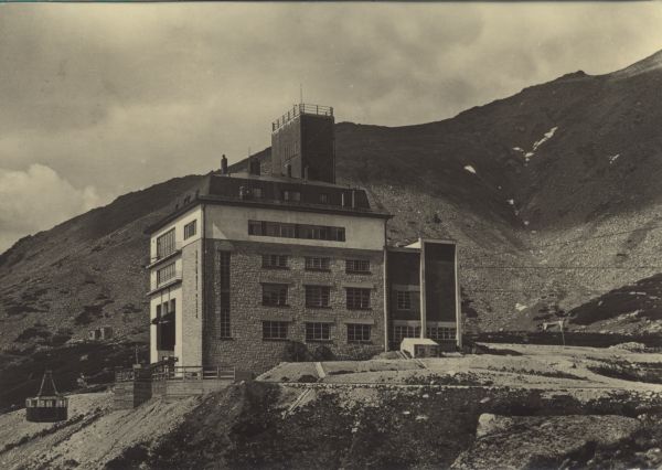 Widok na budynek stacji kolei linowej oraz hotel Encián (Gencjana) nad Łomnickim Stawem.
