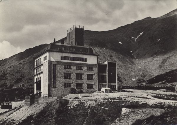 Widok na budynek stacji kolei linowej oraz hotel Encián (Gencjana) nad Łomnickim Stawem.