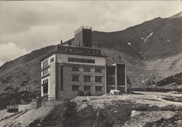 Widok na budynek stacji kolei linowej oraz hotel Encián (Gencjana) nad Łomnickim Stawem.