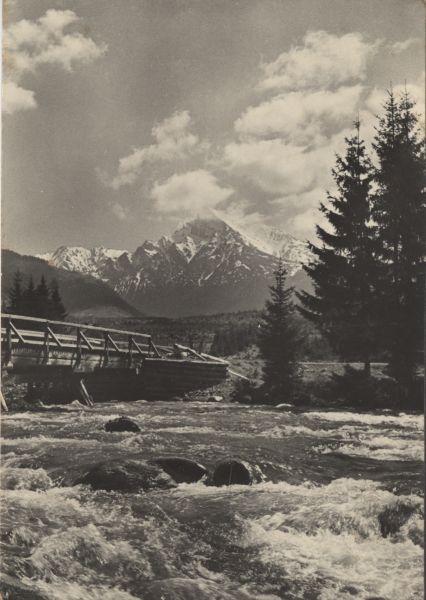 Za¶nieżony szczyt Krywania z Podbańskiej. Na pierwszym planie most na Koprowej Wodzie.