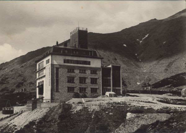 Widok na budynek stacji kolei linowej oraz hotel Encián (Gencjana) nad Łomnickim Stawem.